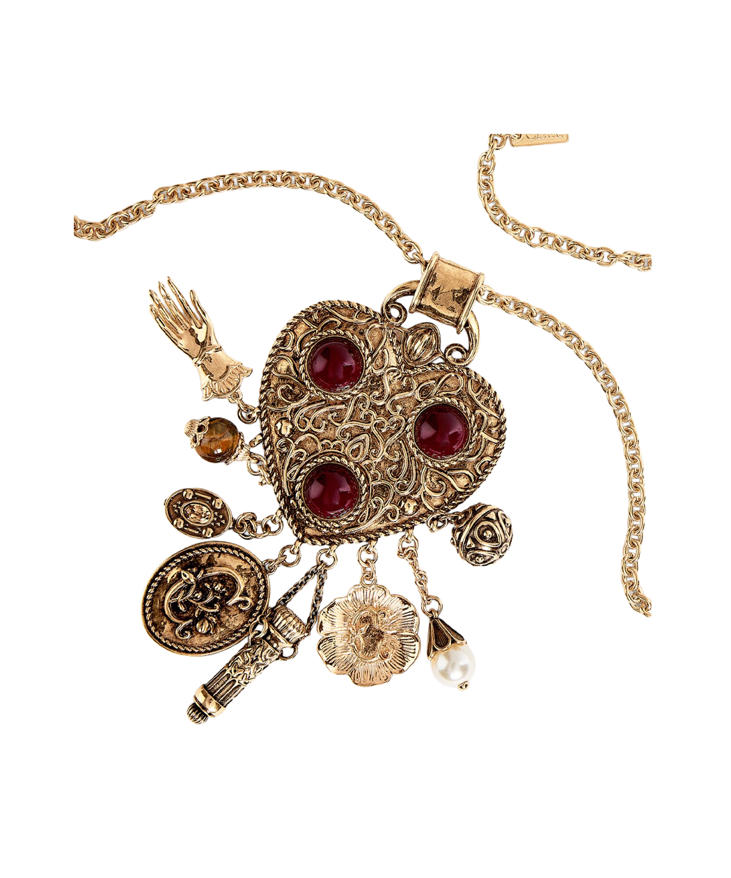Antiqued gold-tone hardware gives this accessory a pre-loved feel. The word trinkets brings to mind images of antique jewellery discovered in quaint vintage shops – a nostalgia that Chloé has harnessed in its latest accessories collection. This necklace features a delicate gold-tone chain with a small heart pendant suspended from it, reminiscent of a cherished find from a bygone era.