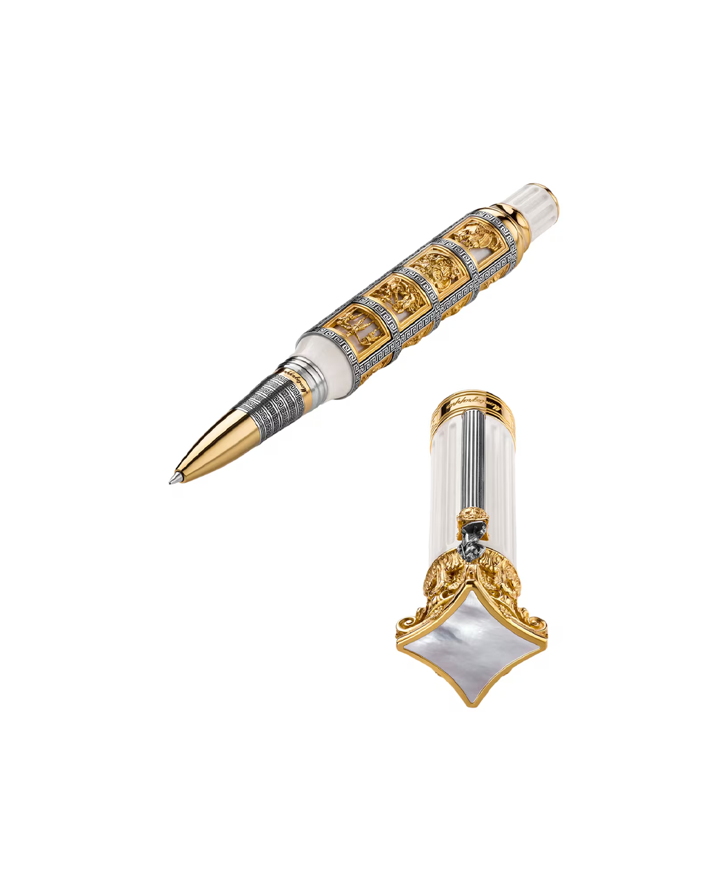 Episodes from Odysseus’ perilous return from the Trojan War are framed in vermeil and Greek fret. Utilising a wonder of lost wax castings, Montegrappa chronicles one of the greatest stories ever told: the ultimate hero’s journey. Ancient Greece’s Homeric poems have long served as parables of human struggle and triumph, laying the foundation for modern literature, theatre and cinema as we know it. After 2700 years, it’s re-examined once more through the Odyssey Chapter I Rollerball Pen, complete with extraordinary Corinthian flourishes and precious metal trims to appease the gods.