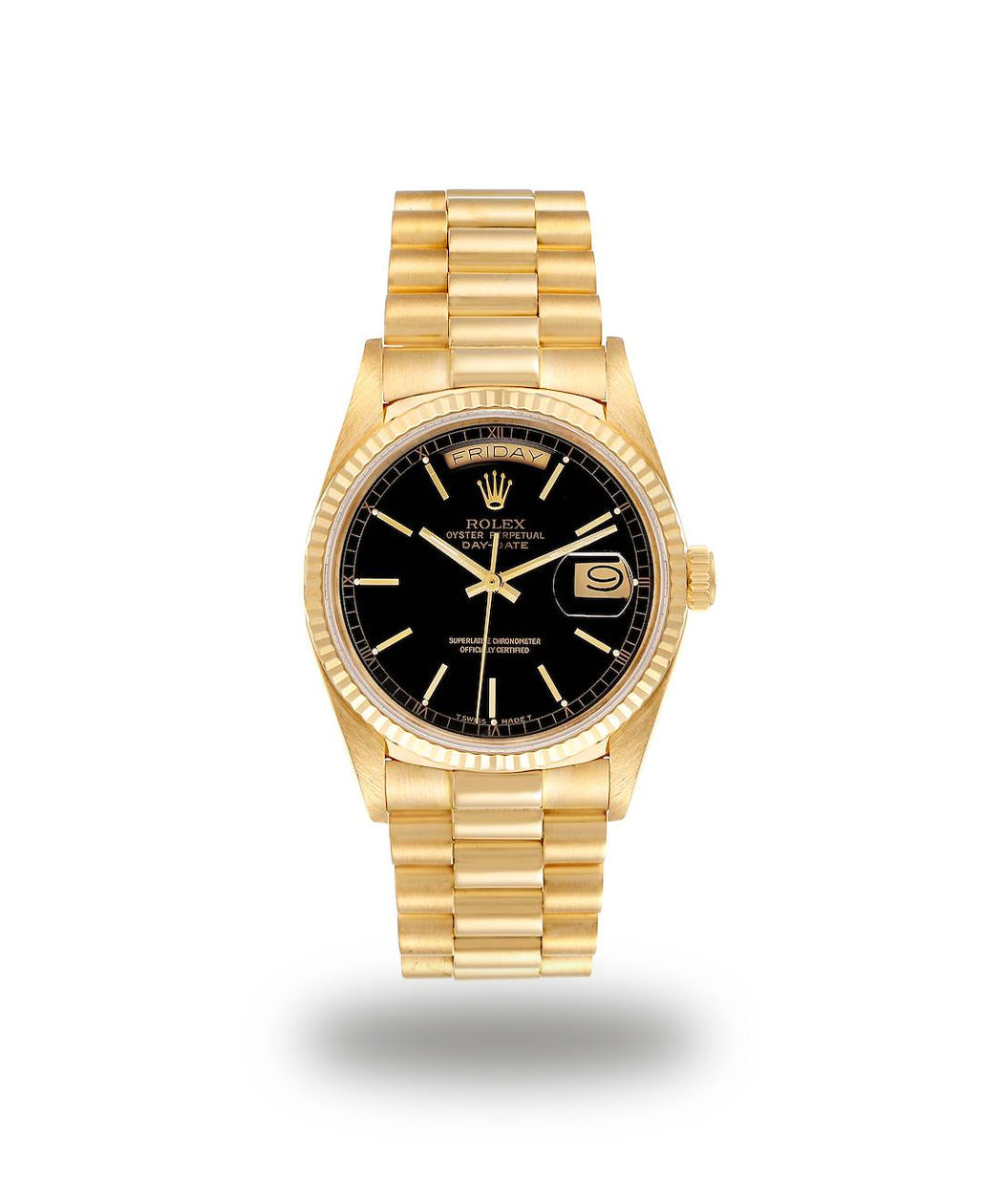| Bracelet: | 18k yellow gold president bracelet with hidden clasp. Fits 7 1/4″ wrist. |