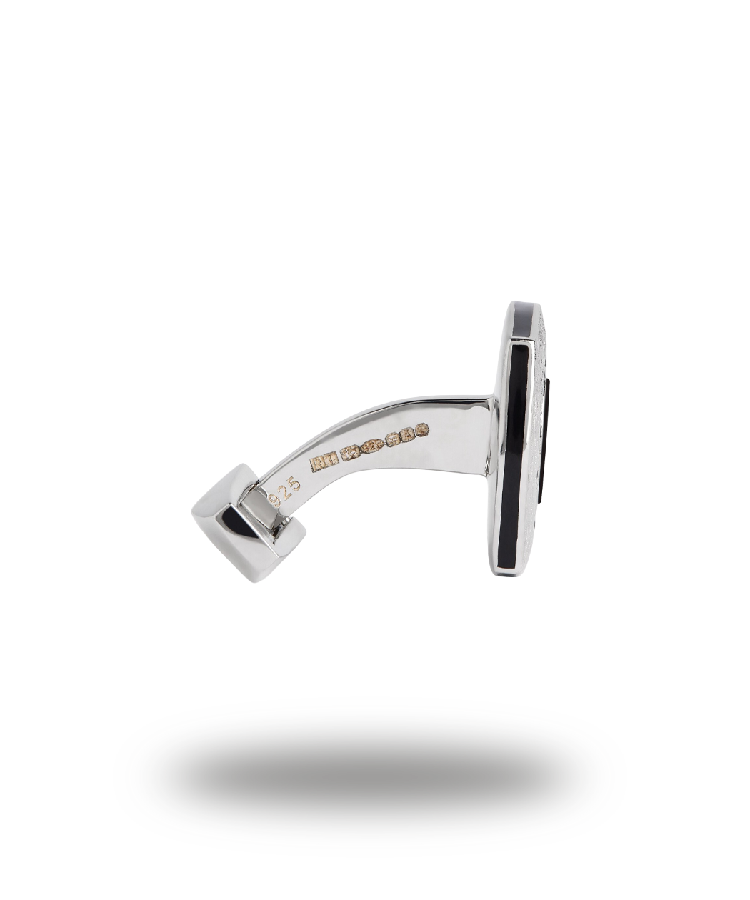 The textured surface showcases the brand’s tactile versatility. Traditional textures are subverted through the Graffiato rounded square cufflinks from Tateossian, featuring a distinctive hand-etched finish that catches the light from every angle. The rhodium-plated sterling silver frame provides a resilient and high-lustre anchor for the central onyx insert, linking the accessory’s physical depth to a design philosophy of contemporary elegance.